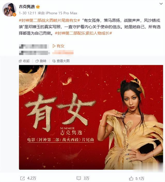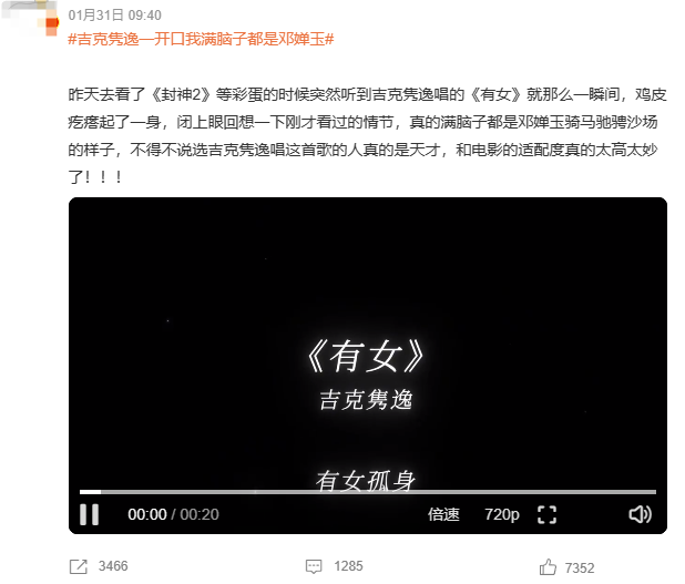 “吉克隽逸唱出了邓婵玉的一生”、“没想到吉克隽逸也是封神2的惊喜”等等。
