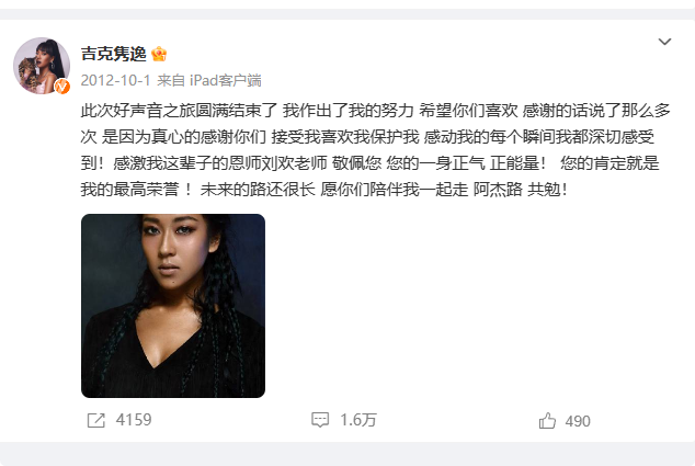 2012年国庆当天,吉克隽逸发文感谢恩师刘欢。